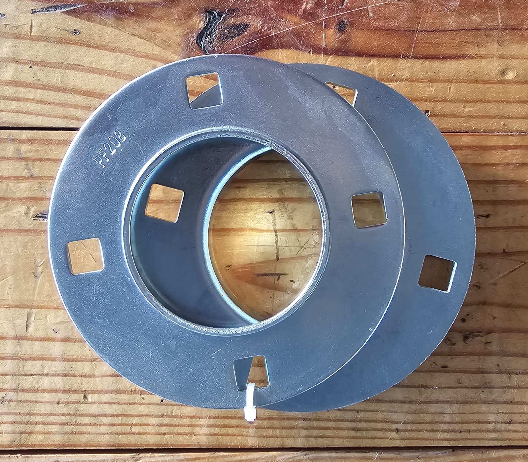 Round, 4 hole, stamped steel flange pair.