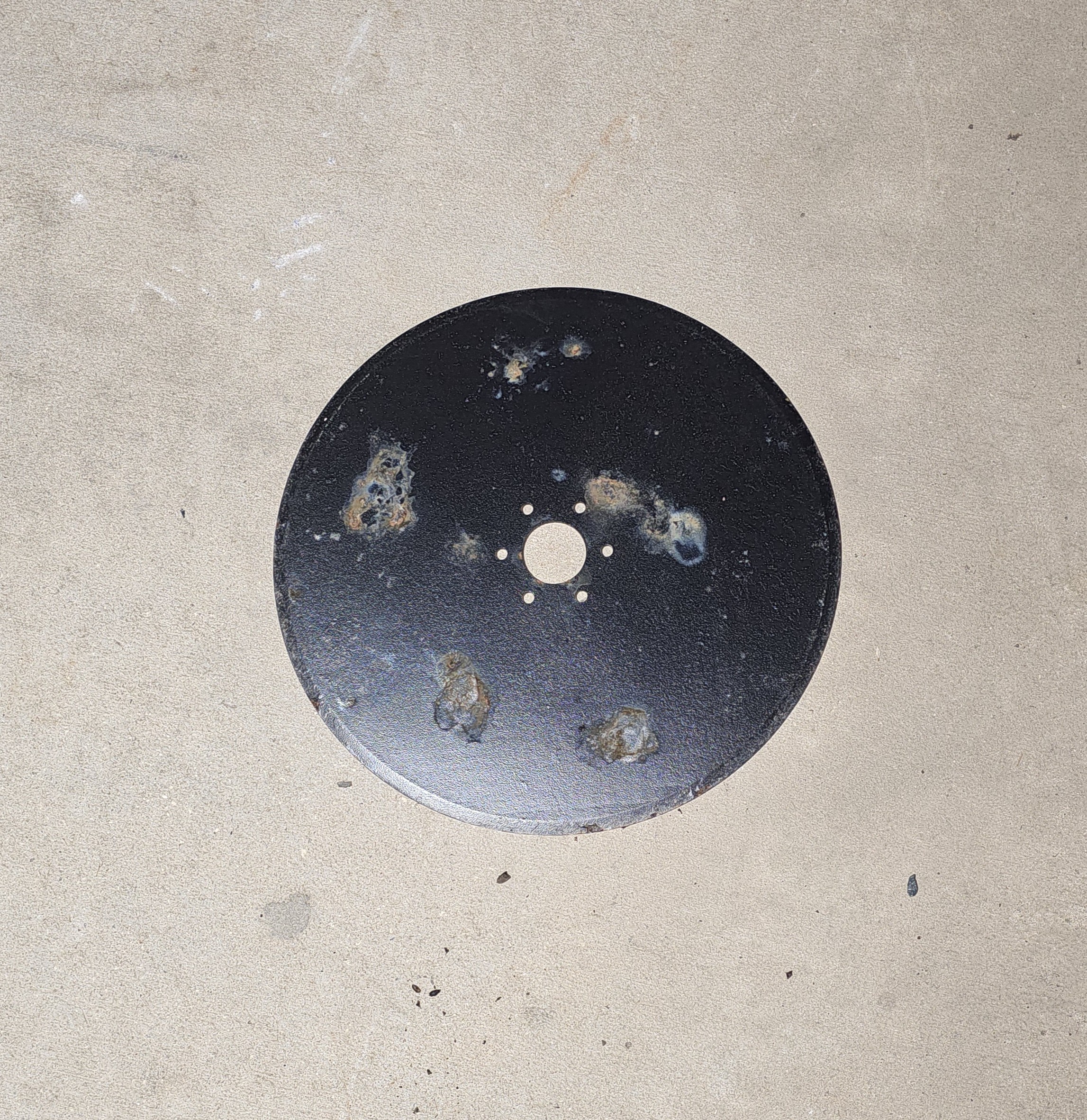 Double punched; 18″ disc; 2-1/4″ pilot hole; six 15/32″ bolt holes on a 3-3/4″ circle; 8ga.