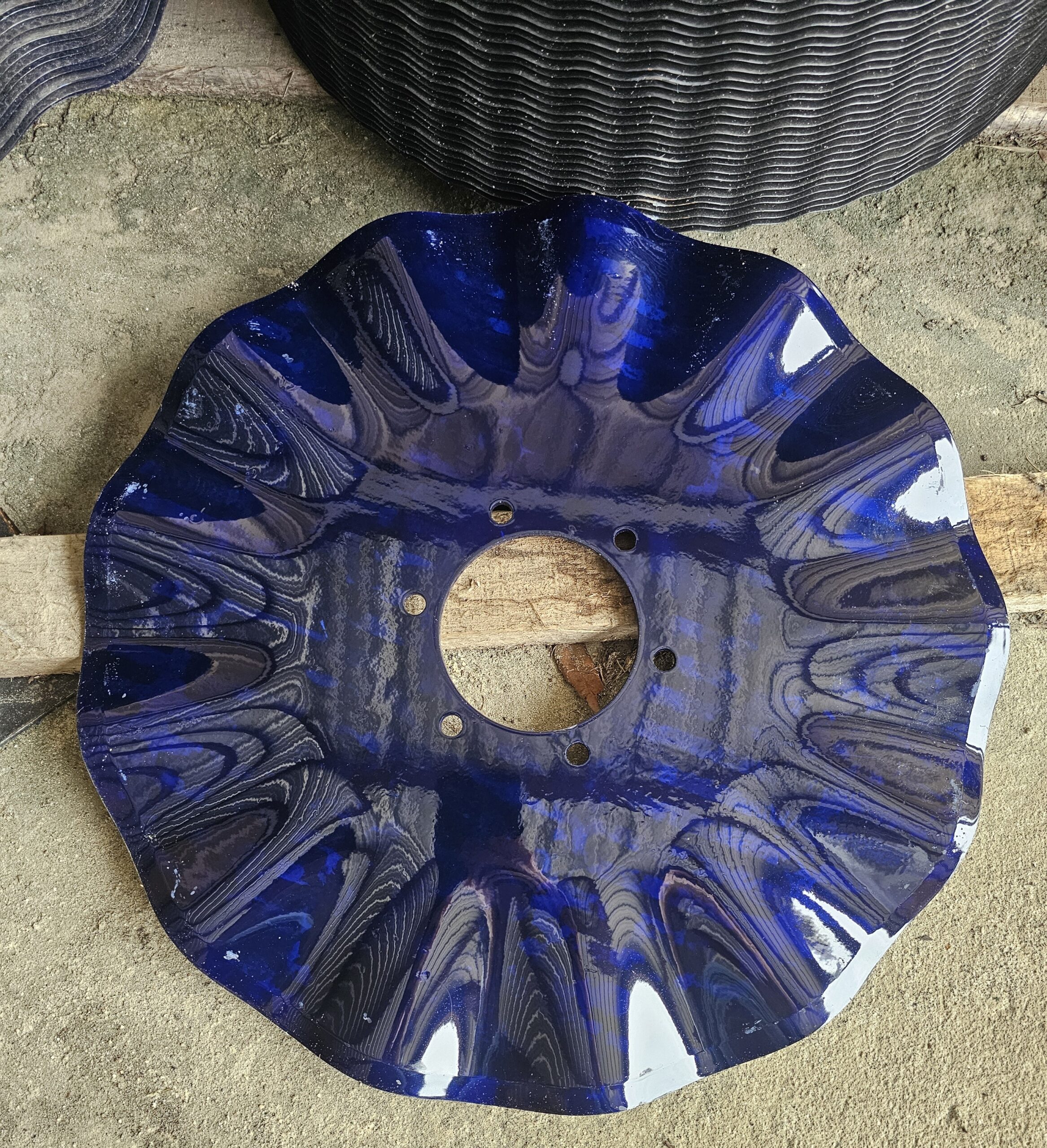 3-11/16″ pilot hole; four 17/32″ bolt holes on a 5″ circle; 3/4 wave; 8ga.