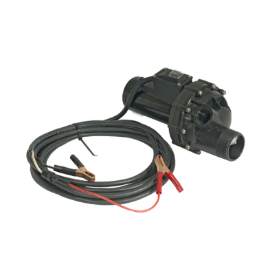 ShurFlo mini-bulk transfer pump with alligator clips and inline fuse. Can prime up to 12 ft (3.7m). Internal bypass to protect pump at shut-off.
